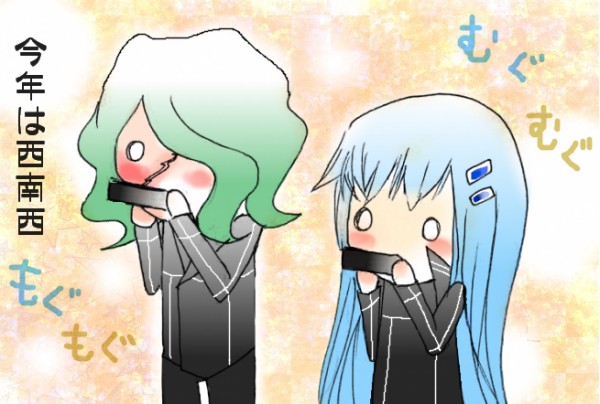 節分ですね。 Category:日常生活 Date:2010年02月03日 また落書きかって話です。困ったものです。 恵方巻きって全部食べると胸焼きしませんか・・・。太巻きは一気食いは胃に重いですよ。太巻きの代わりにロールケーキとかも売ってますけど、少しずつ食べるならまだいいですけど、一気食いは抵抗がありますね・・・。白蘭なら丸々一本余裕で食べそうですね。豆まきの鬼役はトリカブトが適役かと。 追記:恵方巻きは眼を閉じて食べるものなのに思いっきり目開いた状態で描いてしまいました。やっちたー。 続きでお返事です。遅れて申し訳ありません。 続きを読む PR