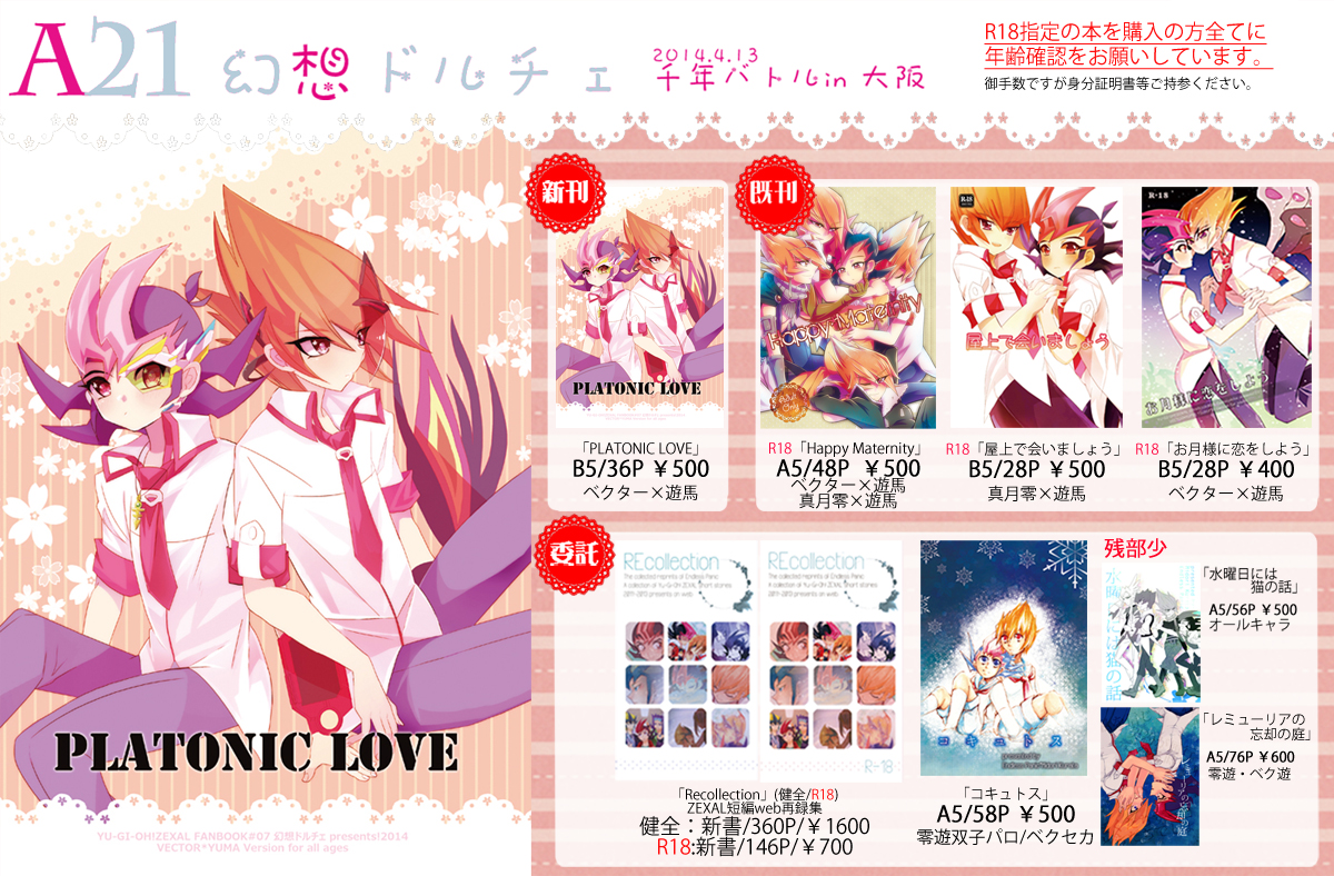 阪バト新刊です。 Category:日常生活 Date:2014年04月11日 【A21/幻想ドルチェ】PLATONIC LOVE B5/36P/500円 表紙です。えっと、いつだっけ、水曜日に脱稿してたんですが、イベント2日前になってましたね。はい。 以下サンプルです。 後ほど、追記でお品書きものせます。 カラーページ入れようと思ったんですけど、印刷所変えたので断念しました。けど、本文色かえと角丸加工を予定してるのですごく仕上がりが楽しみです〜!