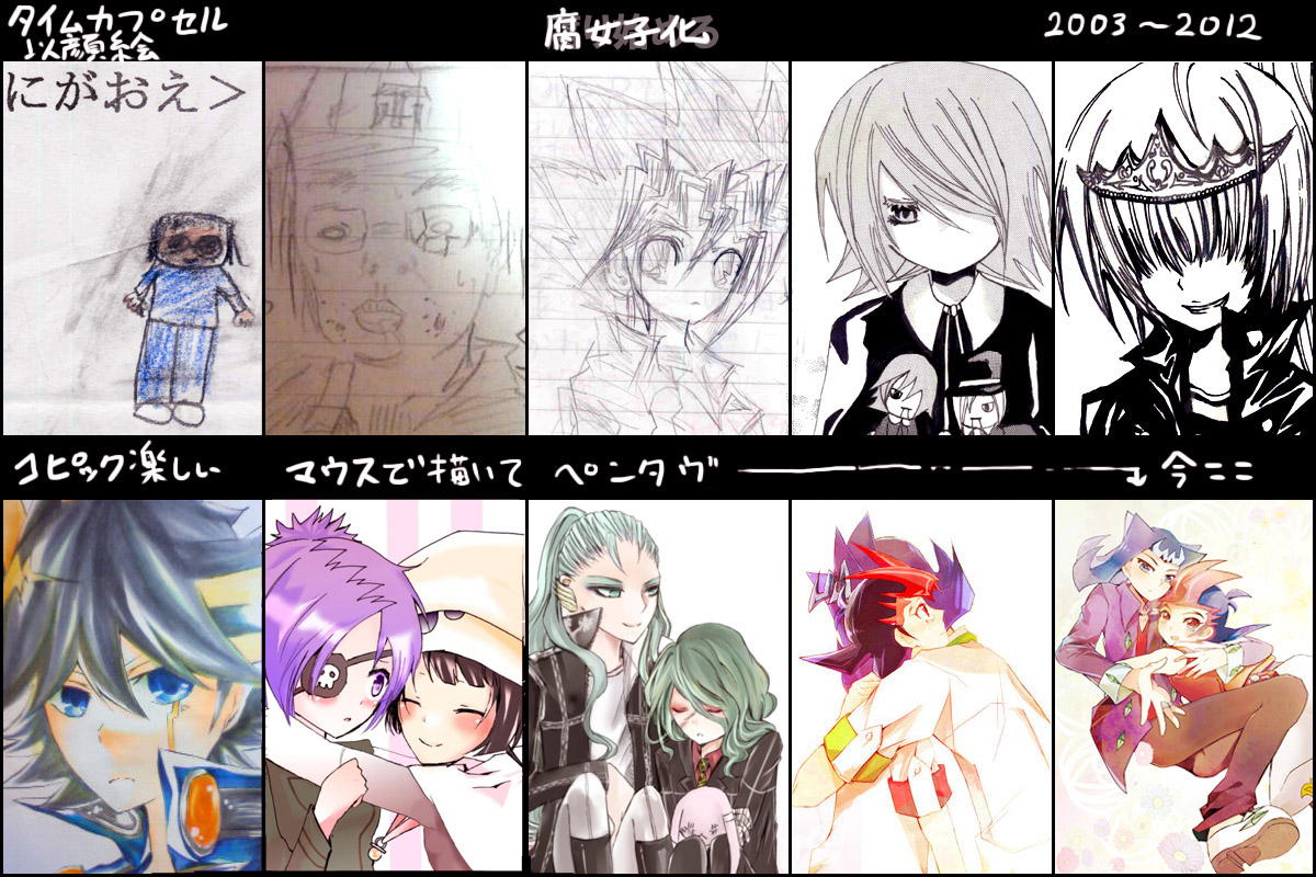 10年進化録 Category:日常生活 Date:2012年12月31日 フォルダ整理がてらにまとめてみました(2003~2012) 特に突っ込みどころはないですね。 なんというか今年が今日で終わるという自覚あんまりないですねぇ…。あ、でもどうぶつの森でちゃんと年越しそばもらってきましたw 昨日今日でがっつりばっさり部屋掃除しましたが、まぁまぁ紙類の多いこと…古紙回収袋がパンパンです。とりあえずさっぱり。来年の初めあたりで課題提出してしまえば結構落ち着くので原稿するぞ~!!今年は本当にいろんな方とお会いすることができたりアンソロ参加がとても嬉しかったです。主催者様と直接お話しできたり……(ろくなこと喋ってなかったような気がしなくもないですが) 北海道遊馬廃怖くないよ。夏時期はあんまり絵描いてなかったな~。ゲームばっかしてたせいで全然更新してなかった。今年一年振り返ってまず一番最初に出てきた言葉が「ほのぼの詐欺師」なんですが、私詐欺してませんから!と主張して今年締めときます。 たくさん好きなことができていい一年でした、来年もよろしくお願いします!!