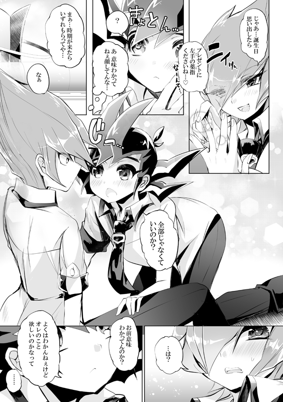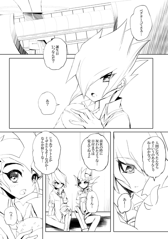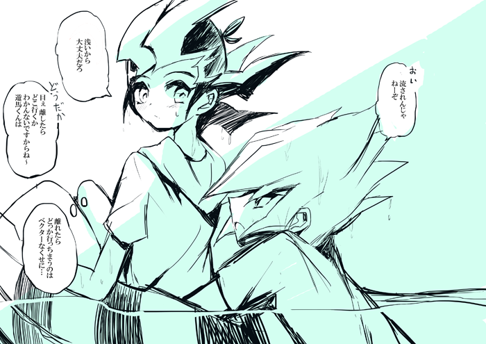 鼻ちょん。 Category:日常生活 Date:2015年08月04日 遊馬のこと意識し始めてドギマギする展開が見たい。 あくふぁでまさかの零児と零羅が血の繋がっていない兄弟という衝撃の真実ぅ~…。初代の遊戯王でもマリクとリシドは血が繋がっていなかったりしましたし…。零羅が自我を持ったことに対して、零児はあれ喜んでたんですね!!?次回予告見て、てっきり反抗期になった弟を威圧してるのかと思いましたよ…。零児は顔に出る感情がわかりにくい。おkわかった。零羅は自我がないゆえになりきる行動をするということで、あのコピーテーマのペルソナデッキにも頷けますね。そして、零羅の代わりに参戦する月影に思いっきり笑ってしまった。アイェエエエエ忍者なんで!! 7月の新刊で感想もらえて嬉しいです…!次の本でも頑張りたいです~!!今回の本は背景とかもガッツリ描いたので、次に出す本も説得力のある画面作りを心がけていきたいですね~。友人に新刊見せたら「厚っ!?」って驚かれましたね。私も会場で実物見たときに、背表紙計算とかはしていましたけど、5mmって厚いですね。次の本のプロットとネーム進めてるのですが、久々に学校風景描けそうで楽しみです。ベクターに制服着せるのが好きなので…!あと、多分バリアン七皇描けそうなのでそのページ描くのが今から楽しみです。久々にデュエカやってたらミザちゃんとドルベの声が好みでときめきましたね~。いい。 ツイッターのタグで描いたものです。久々に遊矢描きました。